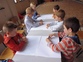 Er werden ook magjes gemaakt... Een octopus en een visje van een rondje.Of een onderwaterwereld waarbij ze eerst met blauwe snippers een blaadje vol kleefden, daarna maakten ze zeewier en knipten ze kleine visjes om in de zee te kleven.